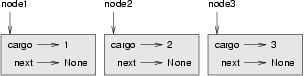 This code creates three nodes, but we don't have a list yet because the nodes are not linked. The state diagram looks like this:
