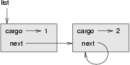 There is nothing to prevent a node from referring back to an earlier node in the list, including itself. For example, this figure shows a list with two nodes, one of which refers to itself: