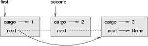 The reference of the third node is None, which indicates that it is the end of the list. Now the state diagram looks like this: