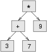 In this section, we parse infix expressions and build the corresponding expression trees. For example, the expression (3+7)*9 yields the following tree: