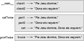 Die Anordnung des Stacks zeigt den Programmablauf. printTwice() wurde von catTwice() aufgerufen, und catTwice() wurde von __main__() aufgerufen; das ist ein spezieller Name für die oberste Funktion. Wenn man eine Variable außerhalb jeder Funktion erzeugt, gehört sie zu __main__().
