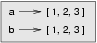 Weil dieselbe Liste zwei verschiedene Namen hat, a und b, nennt man diese beiden Aliasnamen. Verändert man das Objekt, das zum einen gehört, ist der andere mitbetroffen: